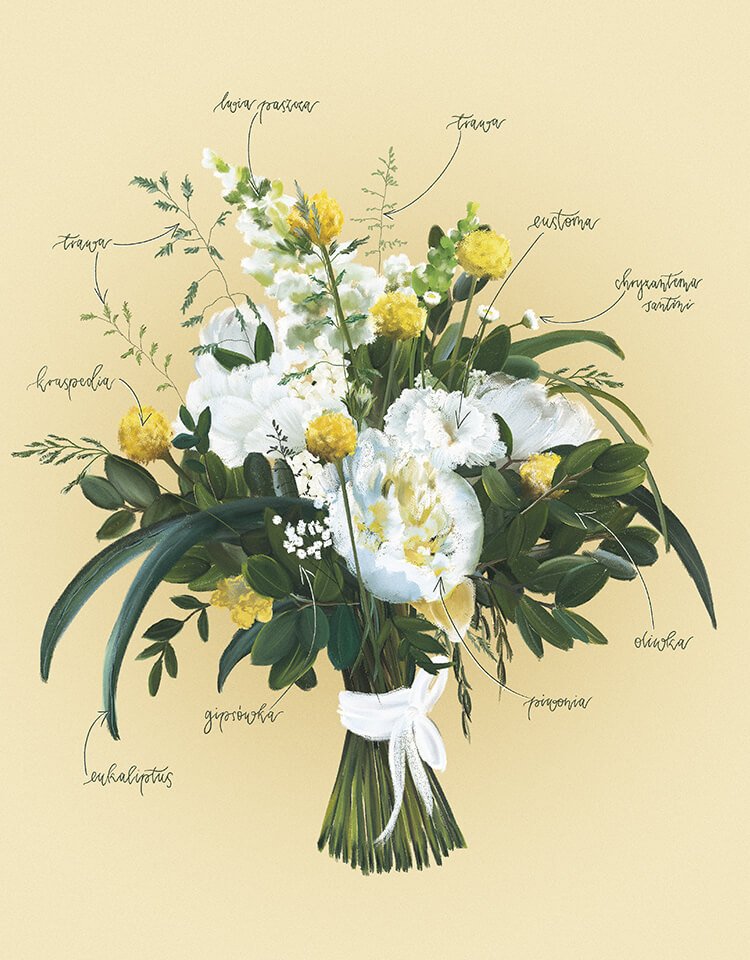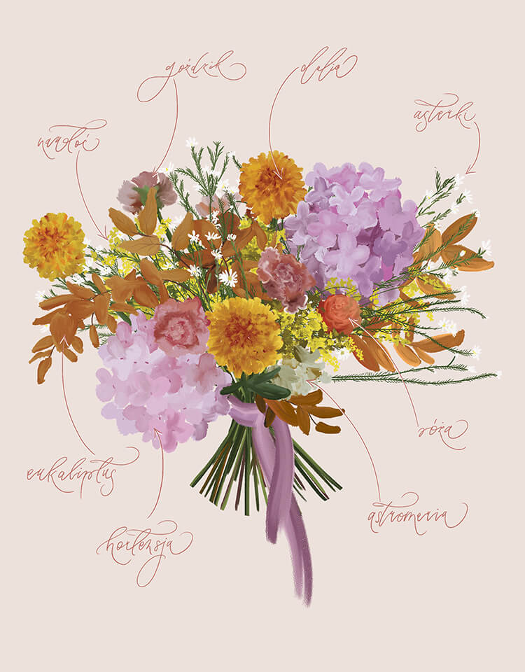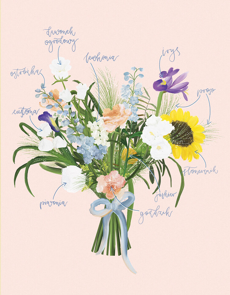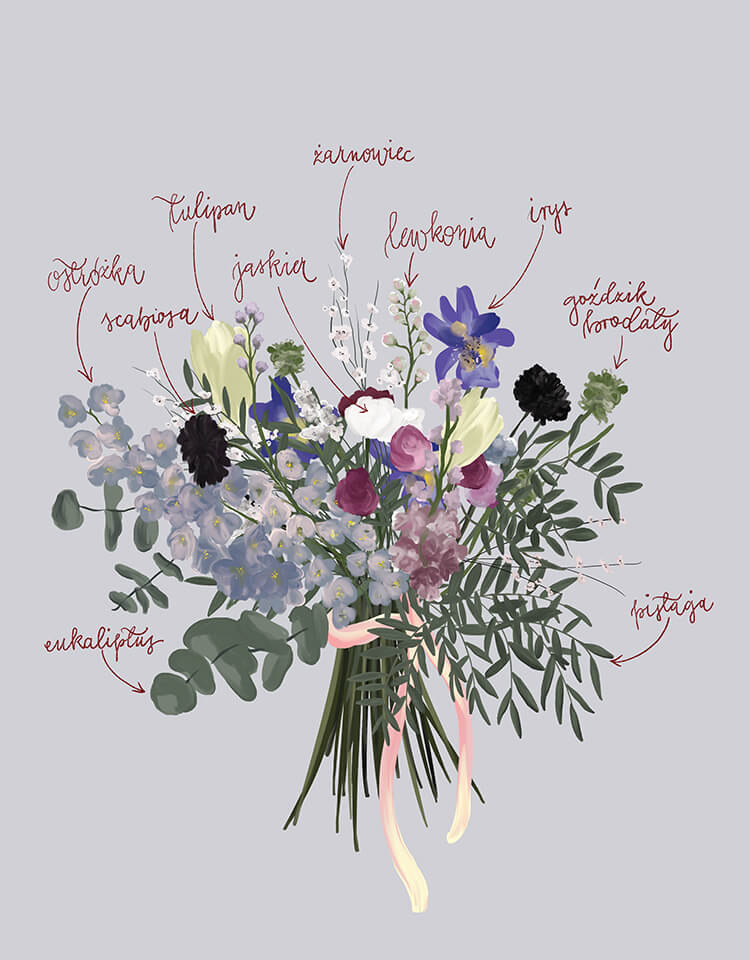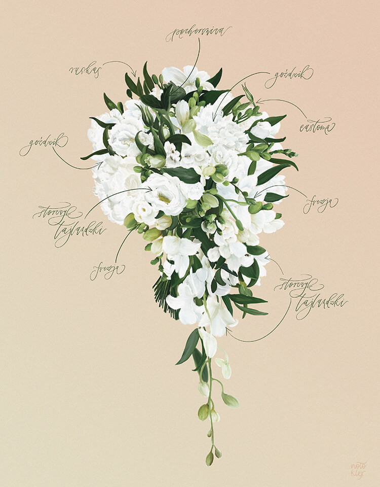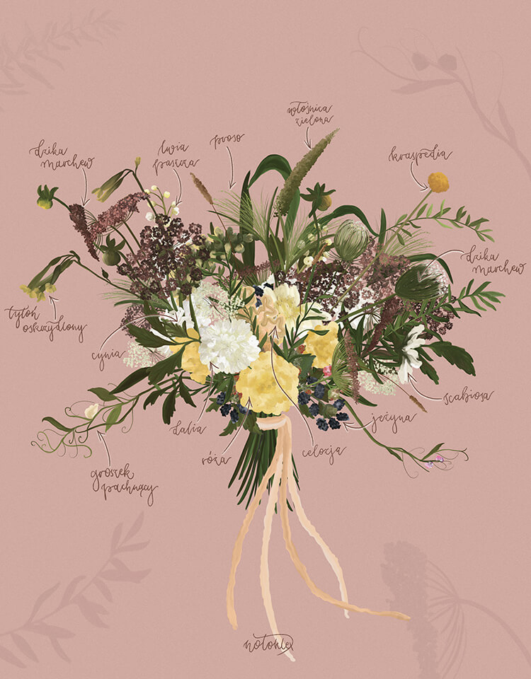 Bukiet każdej Panny Młodej jest wyjątkowy i każda chciałaby zachować go możliwie jak najdłużej. Chętnie wykonam ilustrację Twojego bukietu wraz z opisem roślin, użytych  w tym  dodatku.  Cena ilustracji wraz z drukiem w formacie 30×40 cm lub A4 (21×29,7 cm) – od 300 zł. Wypełnij formularz kontaktowy lub napisz bezpośrednio na maila: kontakt@notoklex.pl, dołączając zdjęcie bukietu w możliwie jak najlepszej jakości. Zdjęcie powinno przedstawiać bukiet od frontu.